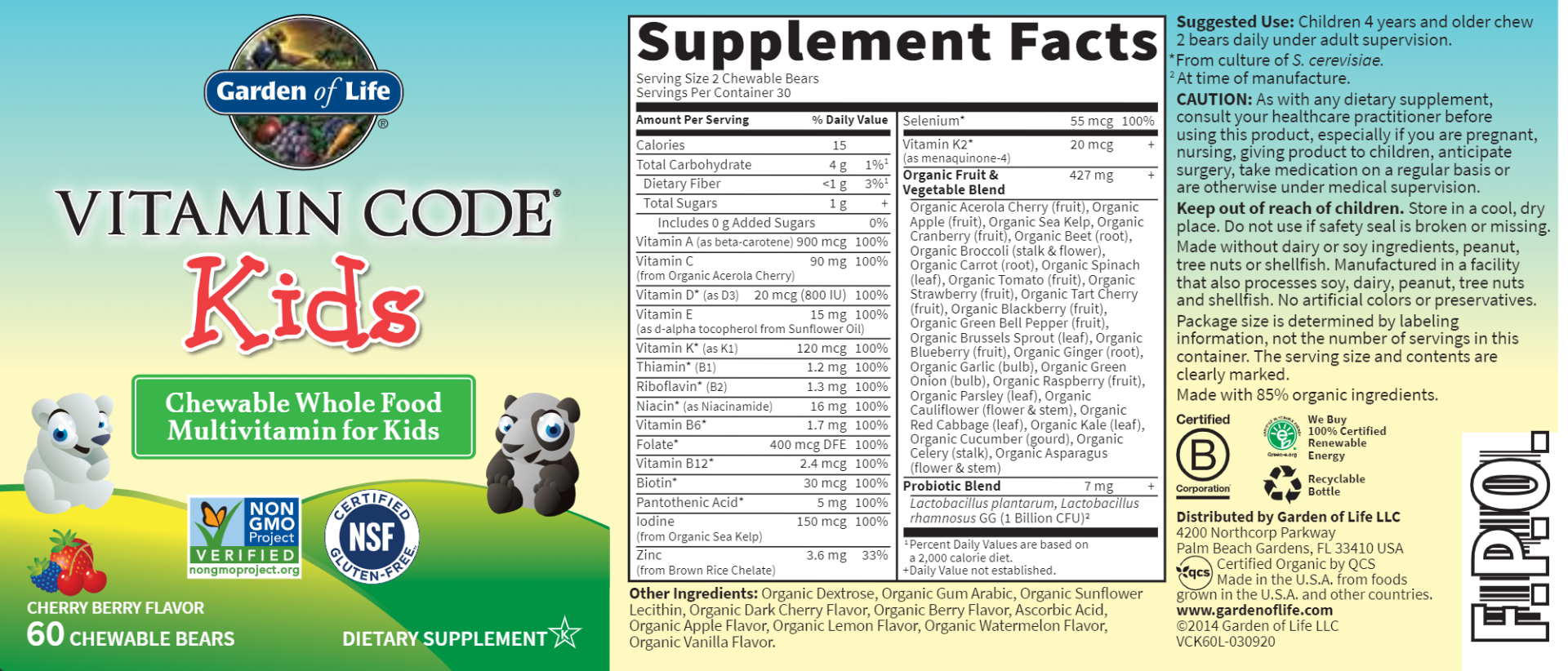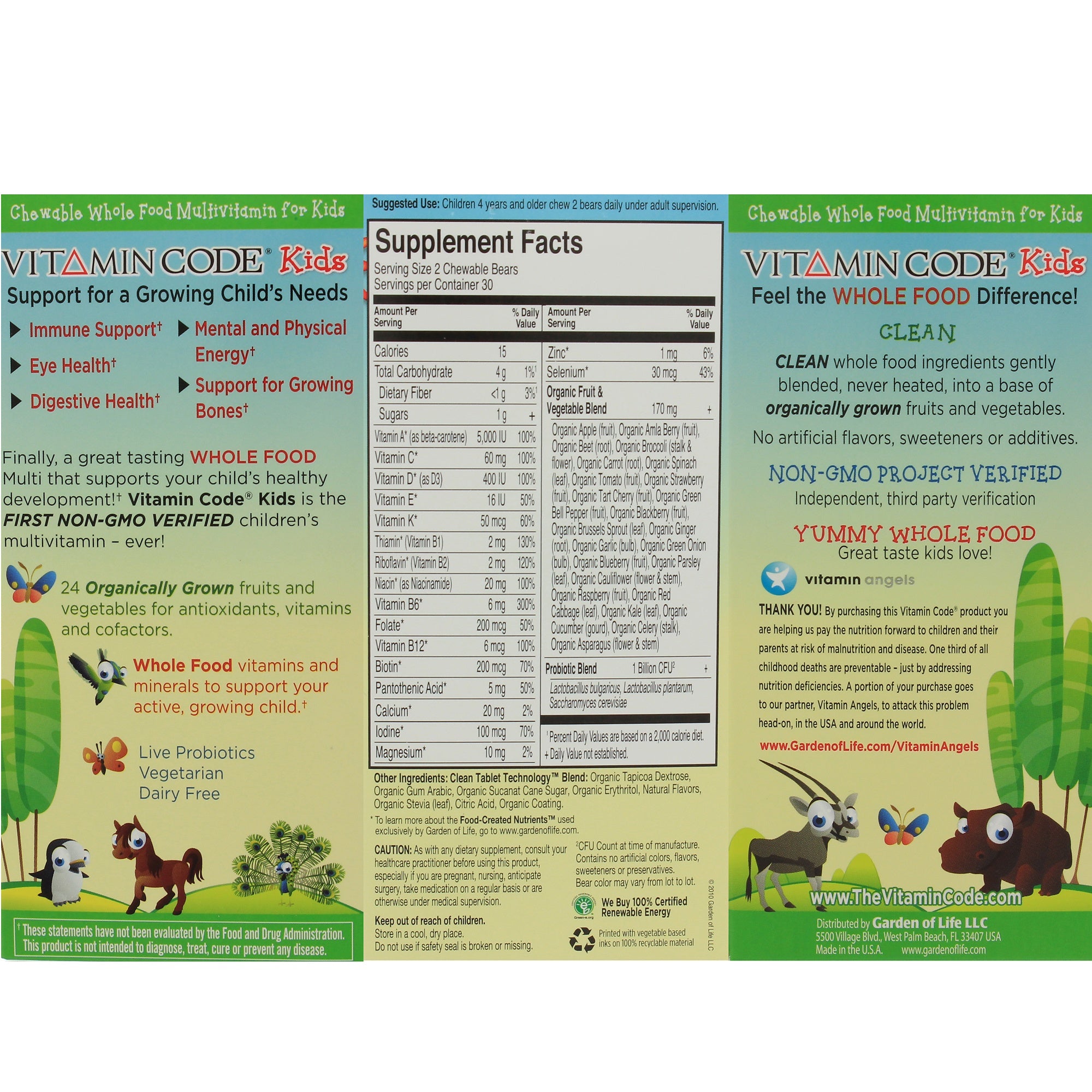 Vitamin Code Kids is a great-tasting chewable whole food, Non-GMO Project Verified multivitamin to support your child’s healthy development.† Made with Vitamin Code vitamins and minerals in a base of 25 family-farmed fruits and vegetables, Vitamin Code Kids supports your active, growing child.† Clean whole food ingredients are gently blended, never heated, into a base of fruits and vegetables—and there are no artificial flavors, sweeteners or additives.